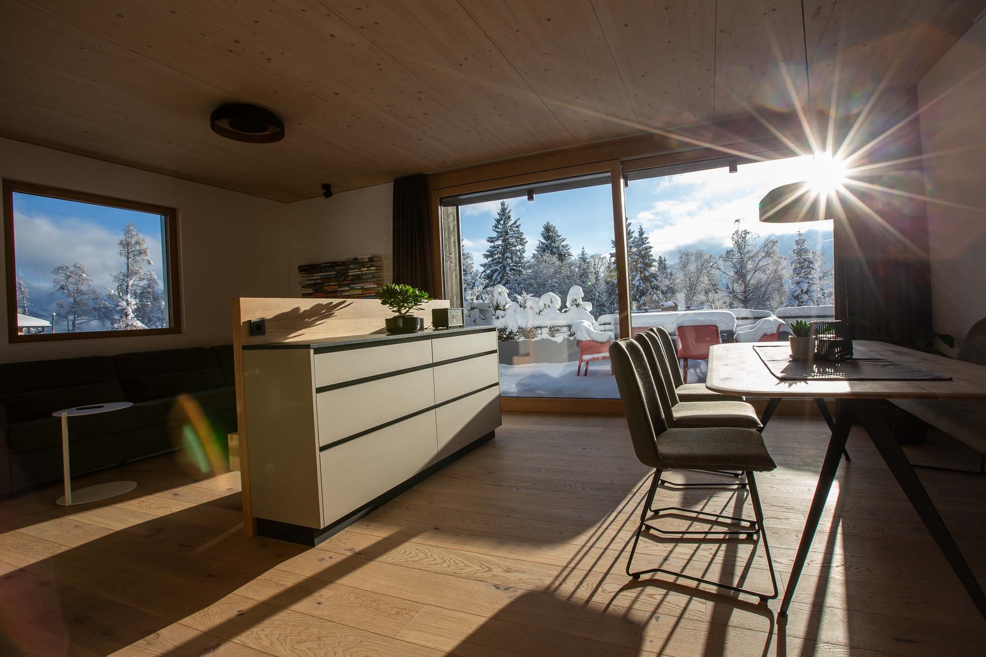 Helle Räume, natürliche Materialien wie Holz und Stein und große Panoramafenster schaffen ein frisches, leichtes Wohngefühl. Die alpine Landschaft wird zum Teil des Hauses – perfekt für alle, die Ruhe, Design und Natur schätzen.